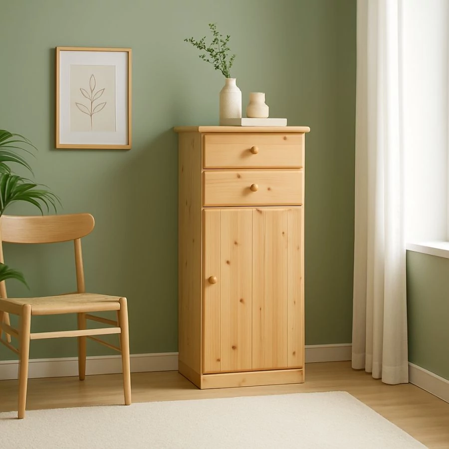 Kiefernholz Kommode, schmal, 1-türig, 2-schubladig, 53 x 128 x 49 cm, natur lackiert