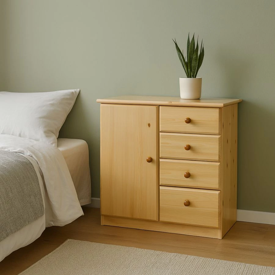 Kiefernholz Kommode, schmal, 1-türig, mit Türanschlag links, 4-schubladig, 102x90x49cm, natur-lackiert
