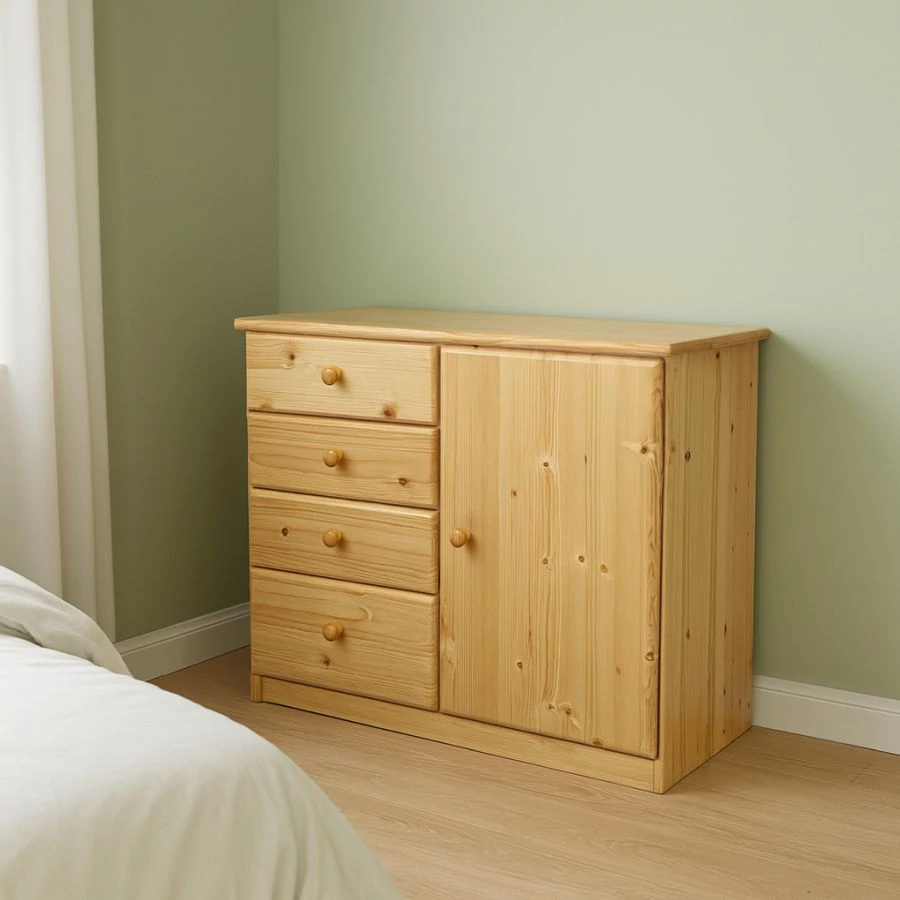 Kiefernholz Kommode, schmal, 1-türig, mit Türanschlag rechts, 4-schubladig, 102x90x49cm, natur-lackiert